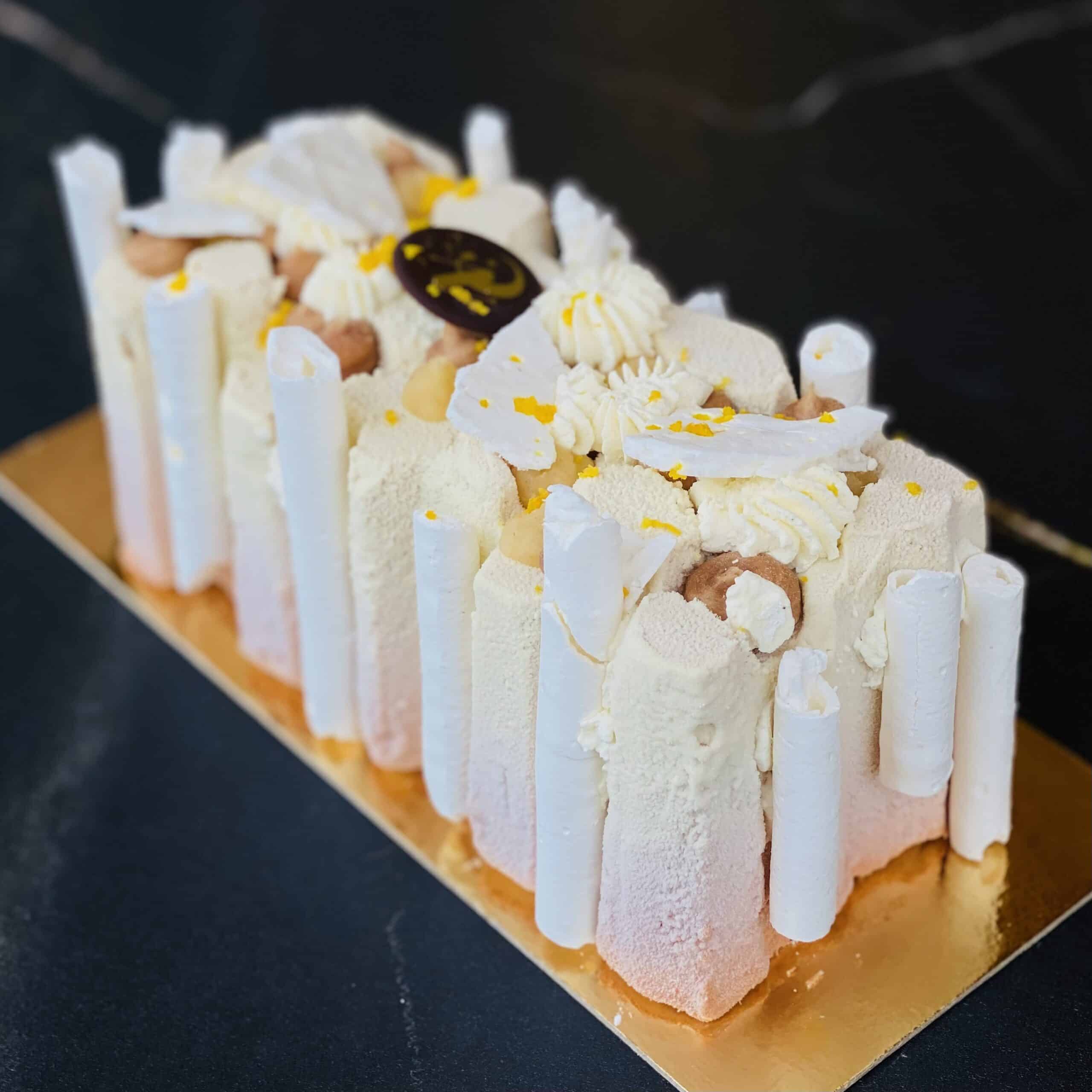 Mariage d’une mousse légère aux marrons, crémeux vanille, gelée yuzu, meringues croquantes