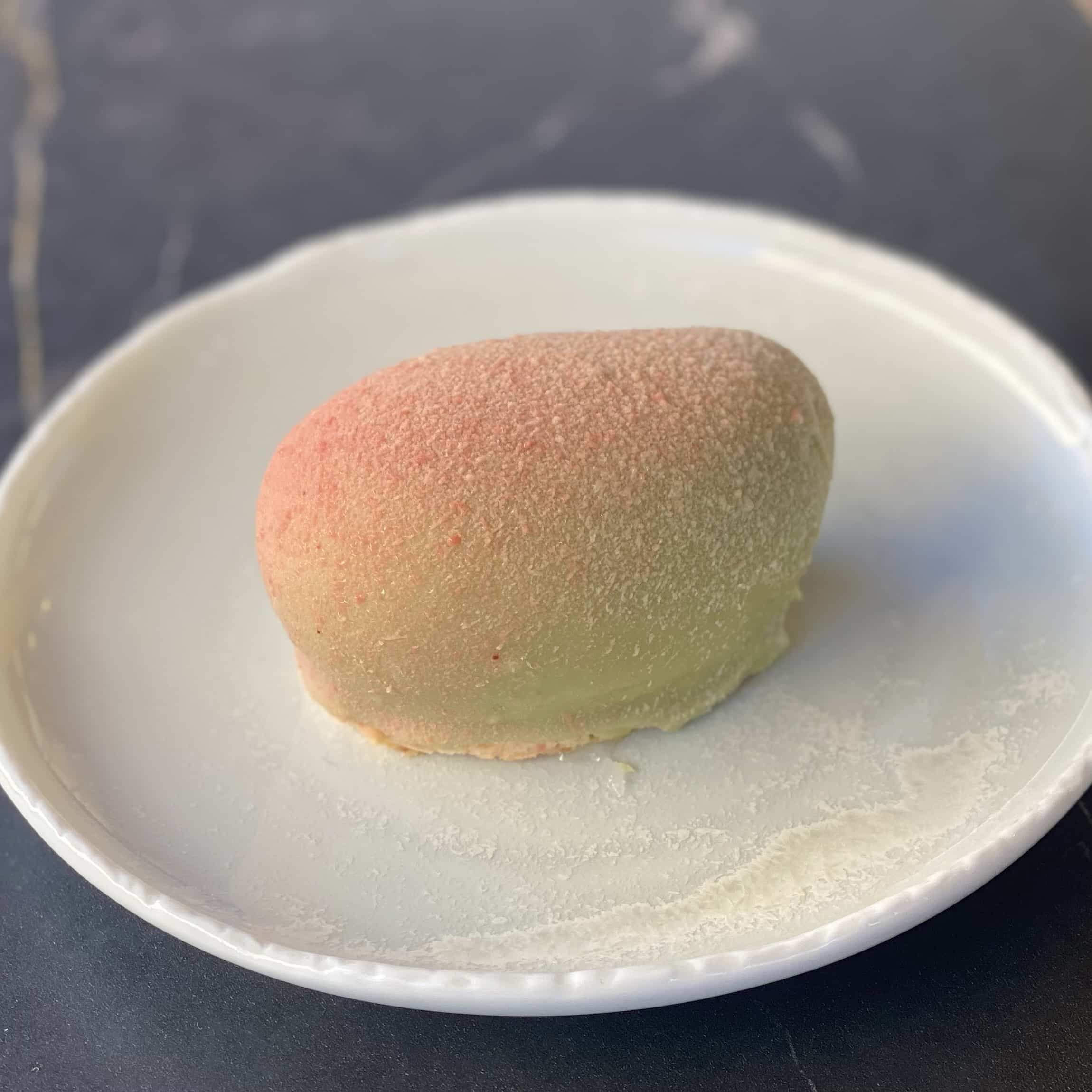 Mangue en trompe l’œil, biscuit japonais, crémeux matcha, mousse mangue et cœur mangue litchi passion