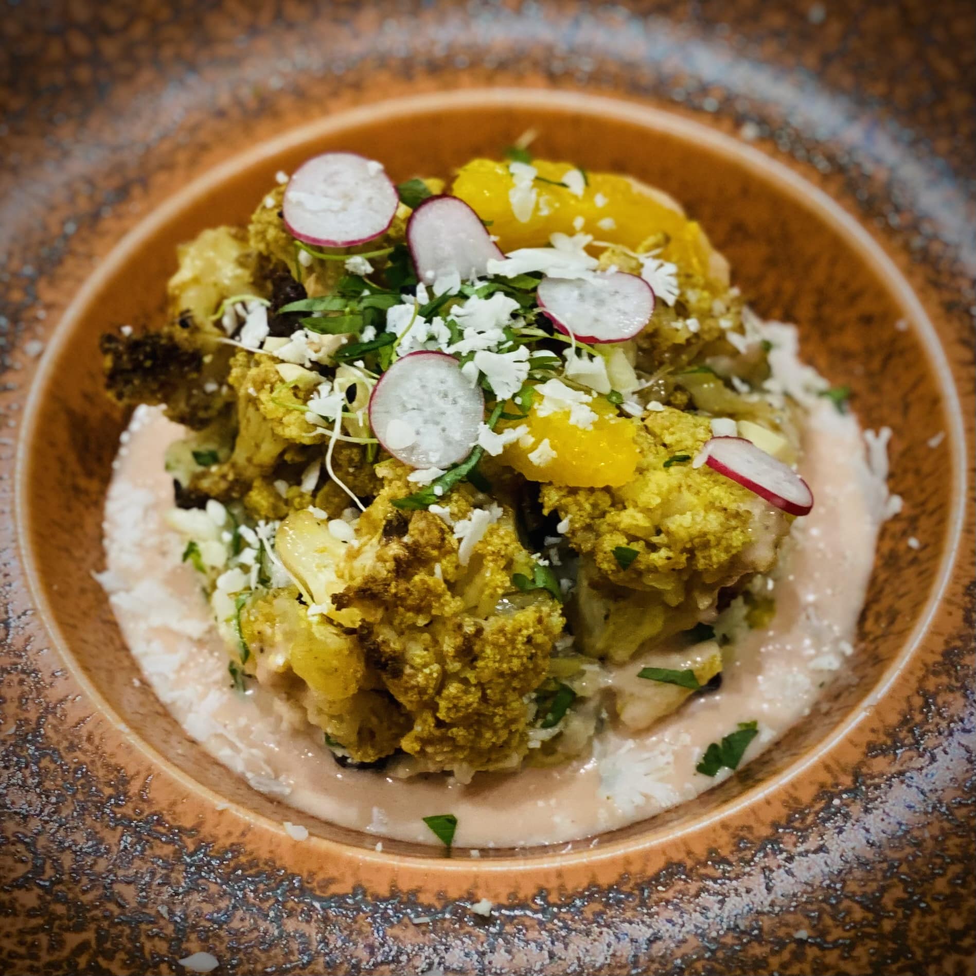 Méli-mélo de chou-fleur cru et cuit à la chermoula, amandes raisins et coriandre, vinaigrette orange sanguine