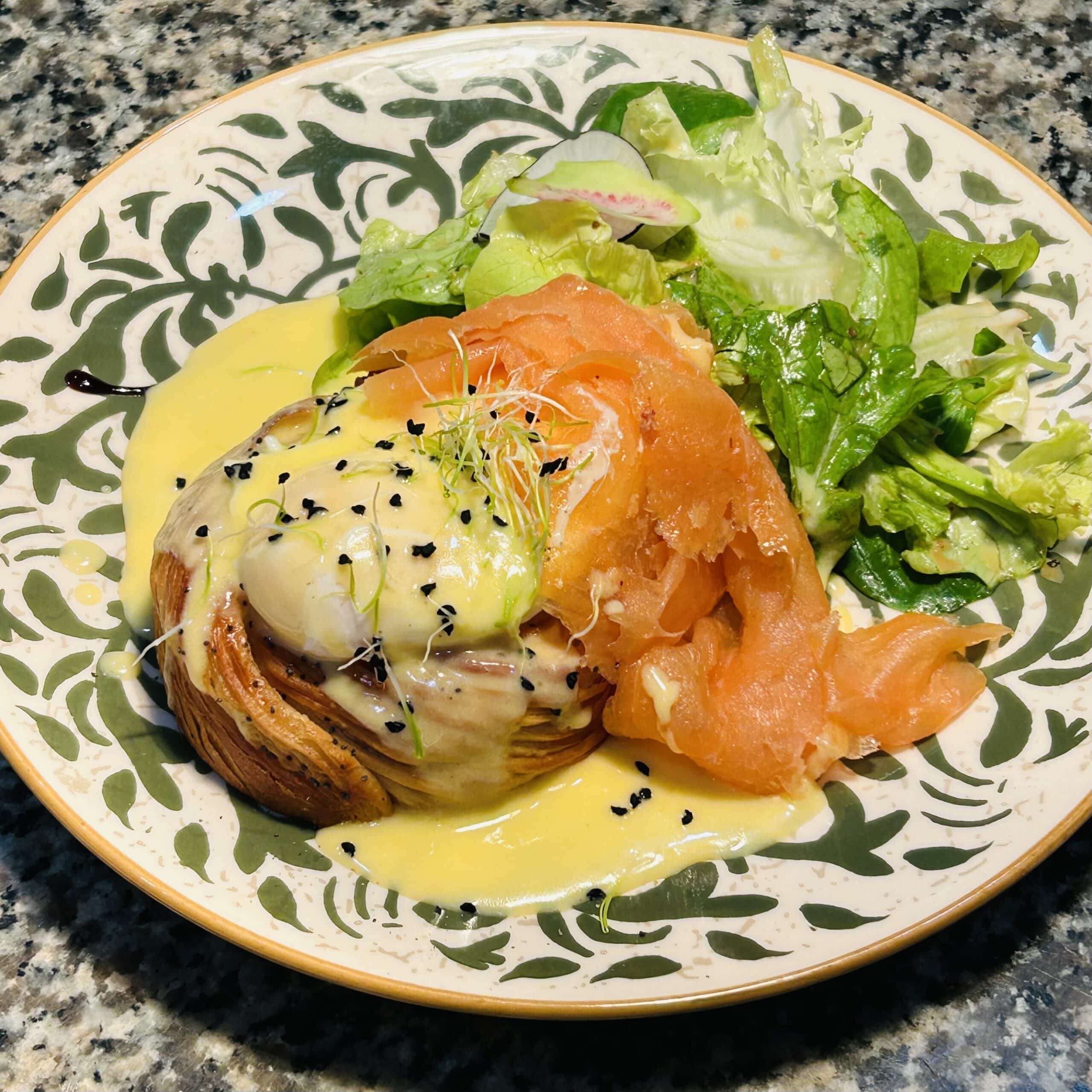 Rolls feuilleté « Bénédicte », écrasée d’avocat, saumon fumé par nos soins, œuf poché et sauce Hollandaise