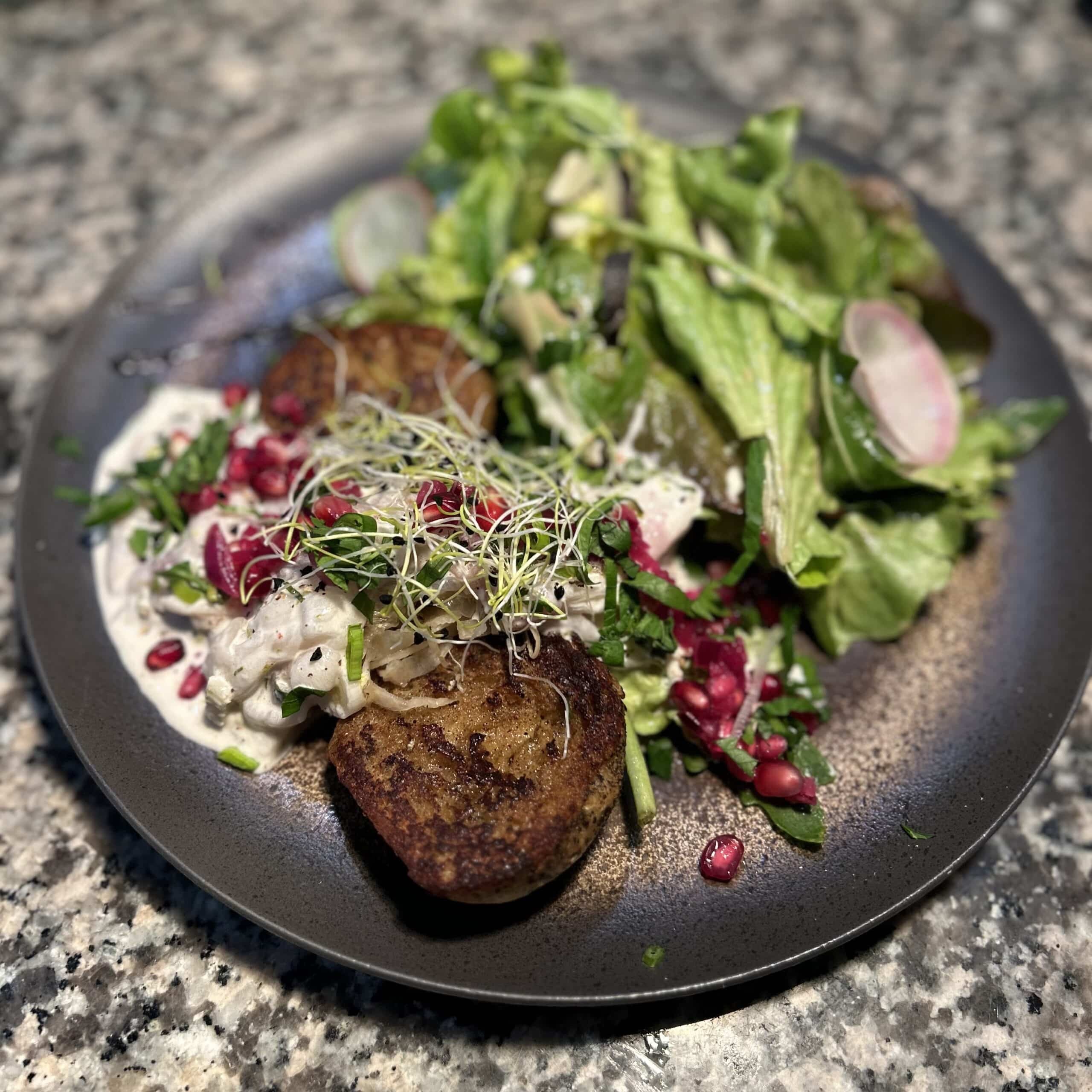 Brioche perdue aux algues d’Aoré, ceviche de bar sauvage coco – grenade et citron vert, fenouil cru – cuit