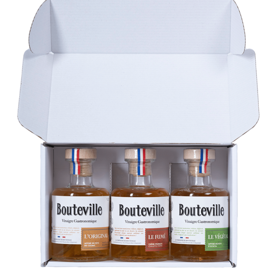 Un coffret assortiment exclusif pour une dégustation inédite, contenant une bouteille de chacun des vinaigres: L’Original, le Fumé, le Végétal.